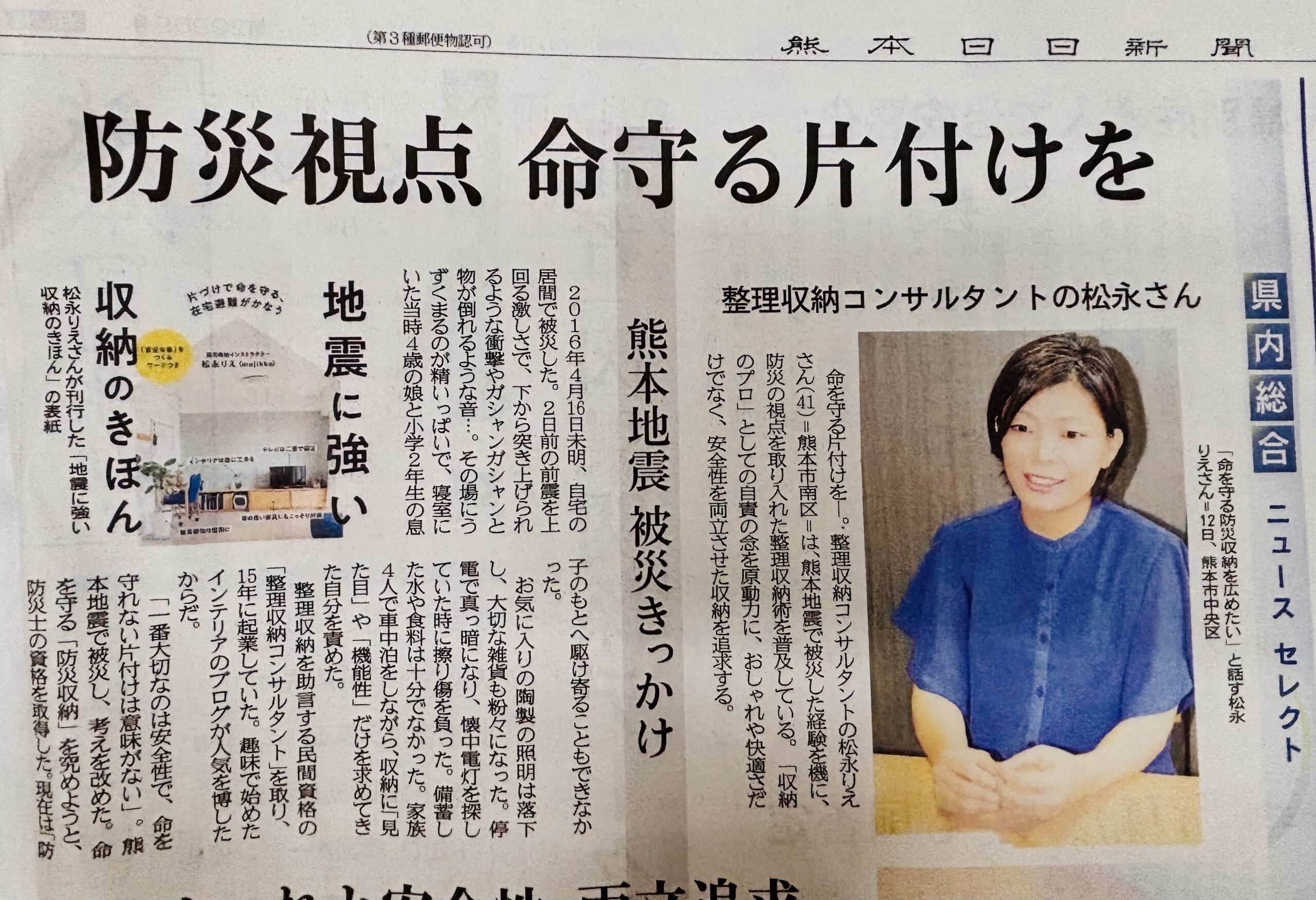 病院勤務時代から続けていた趣味のSNS発信をきっかけに「無印良品マニアのムジッコ」として書籍を出版、2015年に整理収納コンサルタントとして起業。しかし、2016年4月の熊本地震の際に、自宅のテレビは倒れ、天井のライトは割れ、命の危険を感じました。(整理収納アドバイザーなのに…)「安全に片付けないと意味がない!」と痛感し、防災士、防災共育管理士認定講師などの防災の資格を取得。現在は「災害に強い収納(防災収納)」を広めるために、セミナー、書籍、コラム、テレビ、雑誌など、幅広く活動している。